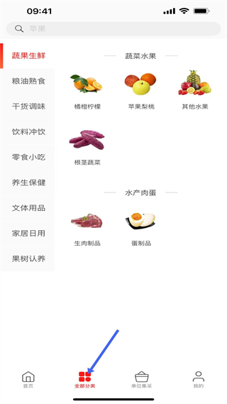 3、全部分類頁,商品分類豐富,有蔬果生鮮、糧油熟食等,蔬果生鮮類細分蔬菜水果、水產肉蛋等品類。