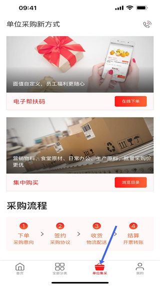 4、單位集采頁,提供兩種采購方式,明確采購流程為下單、簽約、收貨、結算四步。