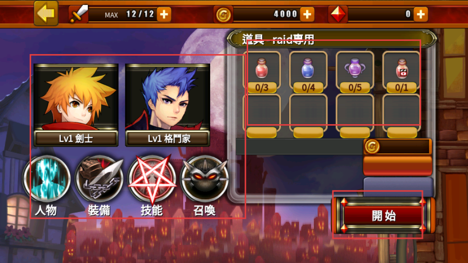2、在角色選擇界面,挑選劍士或格鬥家等角色,查看人物、裝備、技能等,準備好后點擊開始。