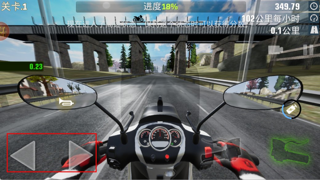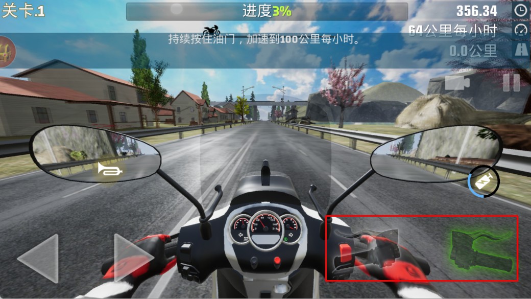 3、駕駛過程,按住右側油門控制區域,能讓摩托車加速,按照提示將速度提升到目標值,推進關卡進度。