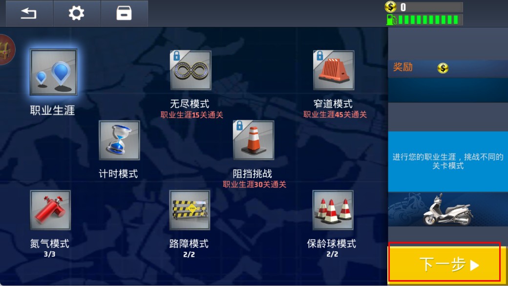 2、在模式選擇界面,有職業生涯、無盡模式等多種游戲模式可供選擇,點擊下一步,可進入所選模式的駕駛場景。