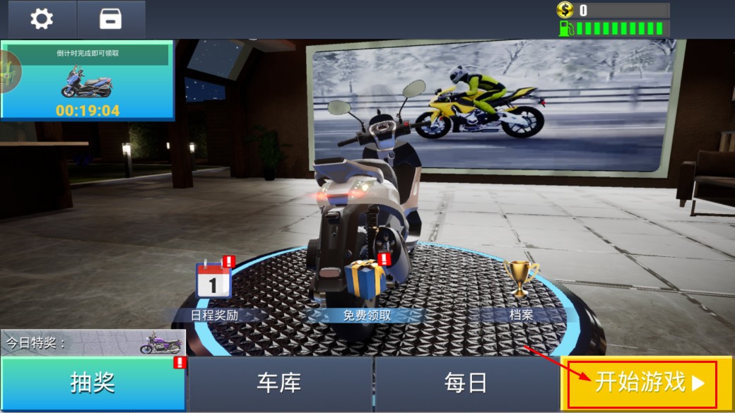 1、進入游戲會看到帶有摩托車的界面,點擊右下角開始游戲按鈕,即可開啟摩托車駕駛挑戰,準備在道路上行駛。