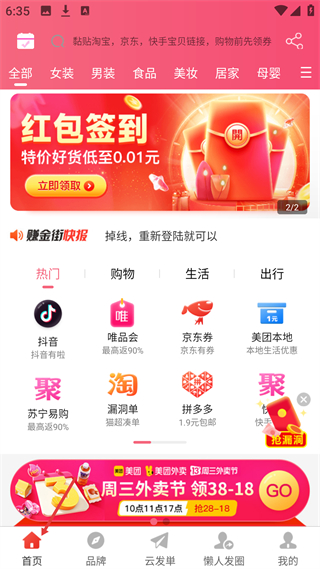2、進入首頁界面,能看到搜索欄可粘貼鏈接領券,還有分類板塊及紅包簽到活動,點擊對應入口可參與相應的優惠活動。