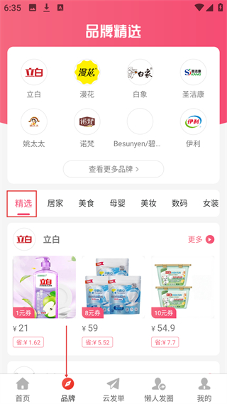 3、進入品牌頁面,能看到立白漫花等品牌精選,還有分類板塊及對應商品優惠券,點擊查看更多品牌可瀏覽更多品牌選項。