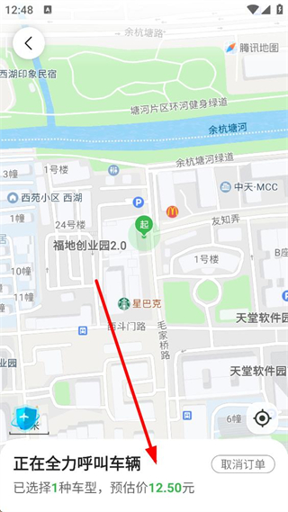 4、操作后進入車輛呼叫頁面,顯示正在全力呼叫車輛,可查看預估價格,同時配備取消訂單的操作選項。
