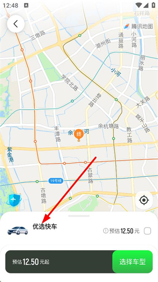 3、進入車型選擇頁面,顯示優選快車選項及對應的預估價格,點擊選擇車型按鈕推進流程。