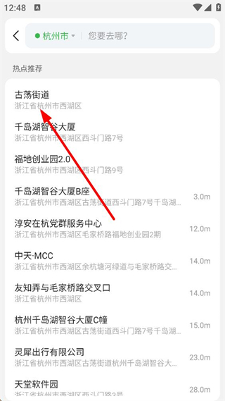 2、進入目的地選擇頁面,呈現熱點推薦的地點列表,選定其中一個地點后,進入車型選擇頁面。
