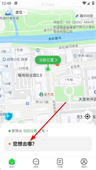 1、進入飛嘀打車的出行頁面,可見當前位置的地圖界面,點擊您想去哪輸入框,進入目的地選擇頁面。
