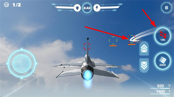 2、戰斗時點擊導彈按鈕,發射導彈攻擊敵方戰機,積累擊毀數,推進空天戰斗進程,獲取勝利。