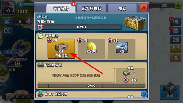 4、在每日任務界面領取每日禮物等獎勵,積累資源,用于戰機升級和武器激活,增強空天戰斗實力。