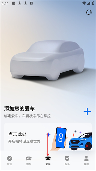 2、愛車頁面,提示添加愛車綁定車輛,可通過操作開啟互聯功能,界面簡潔直觀。