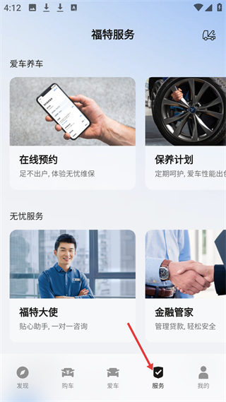 3、服務頁面,含在線預約、保養計劃等服務,還有福特大使、金融管家等板塊,功能豐富。