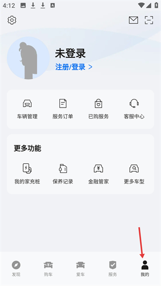 4、我的頁面,顯示未登錄,含車輛管理、服務訂單等功能,還有更多功能選項,布局清晰。