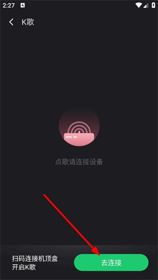 2、進入K歌界面,看到點歌請連接設備的提示,界面底部設有去連接按鈕,點擊該按鈕,就能進入掃碼點歌的操作界面。