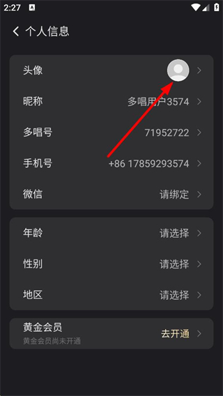 4、進入個人信息界面,可查看頭像、昵稱、多唱號等信息,能編輯個人資料內容,還可選擇開通黃金會員來獲取更多服務。