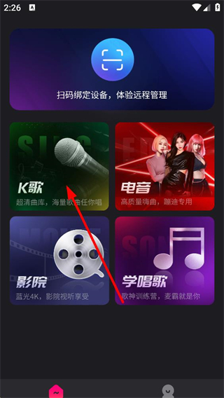 1、進入多唱應用首頁,可見掃碼綁定設備的提示,還有K歌、電音等功能板塊,點擊K歌選項,即可進入對應的K歌功能操作界面。