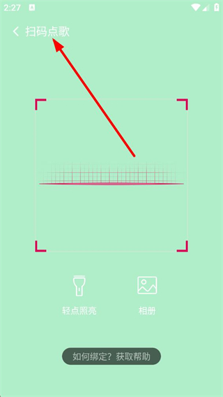 3、進入掃碼點歌界面,有掃碼識別區域,還有輕點照亮、相冊等輔助功能選項,通過掃碼可完成設備綁定以開啟點歌操作。