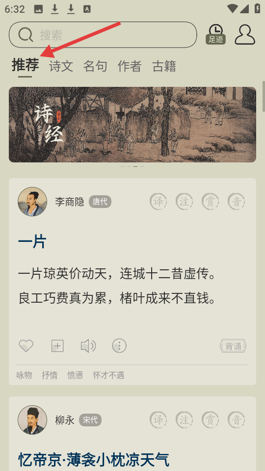 1、推薦界面展示李商隱等詩人作品,一片蘊含詠物與憤懣之情,帶我們領略古人詩意世界。
