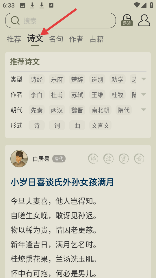 2、畫面呈現應用的詩文界面,可按多種維度篩選,白居易的詩滿含對外孫女滿月的欣喜盡顯舐犢情深。