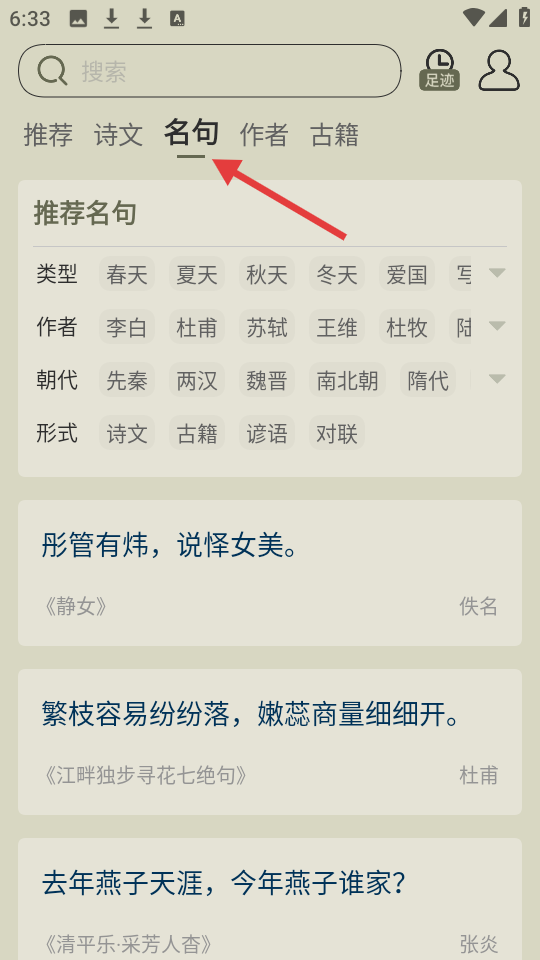 3、此為應用的名句界面,有靜女等經典名句,不同作者的句子風格各異,展現古詩詞的多樣魅力。
