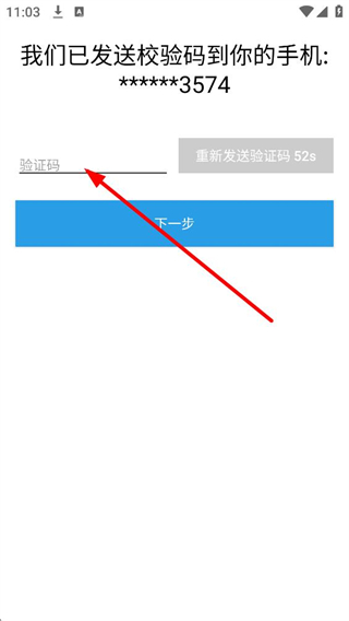 3、注冊過程中會發送校驗碼到手機,需在驗證碼輸入框輸入收到的驗證碼,點擊下一步完成手機驗證,推進注冊流程。
