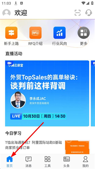 4、完成登錄或注冊后進入應用首頁,可看到新手上路、RFQ介紹等功能入口,還有直播活動、今日學習等內容板塊,底部導航欄有首頁、消息、工具等選項。