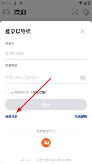 1、進入應用登錄頁面,需輸入登錄名和登錄密碼,勾選已閱讀并同意隱私政策后點擊登錄,也可選擇快速注冊或忘記密碼操作,還有其他登錄方式如淘寶登錄可選。