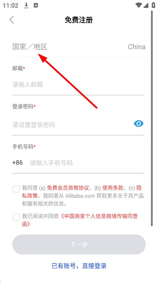 2、在免費注冊頁面,需選擇國家地區,輸入郵箱、設置登錄密碼、填寫手機號碼,勾選同意相關協議和政策后點擊下一步,完成注冊信息填寫。
