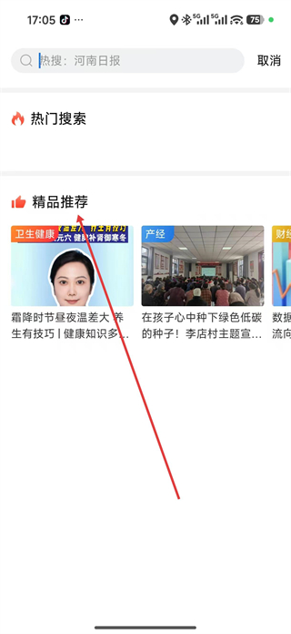 1、進入河南日報搜索頁面,可查看熱門搜索和精品推薦,選擇霜降時節晝夜溫差大養生有技巧的資訊點擊進入詳情頁。