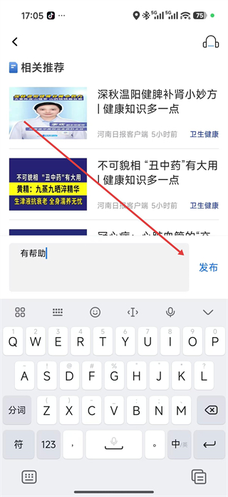 4、輸入評論后點擊發布可將評論分享到平臺,與其他用戶交流互動,也可查看相關推薦的其他健康知識資訊。