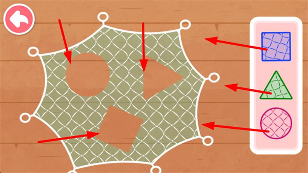 2、接著將裁剪好的不同形狀材料,對應右側模板的樣式進行匹配,把材料放到網格對應的位置,完成捕魚工具的拼接。