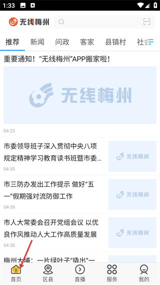 2、登錄后進入首頁,可看到推薦類的資訊內容,頁面頂部有搜索欄,底部有首頁區縣等功能入口,瀏覽各類資訊獲取本地信息。