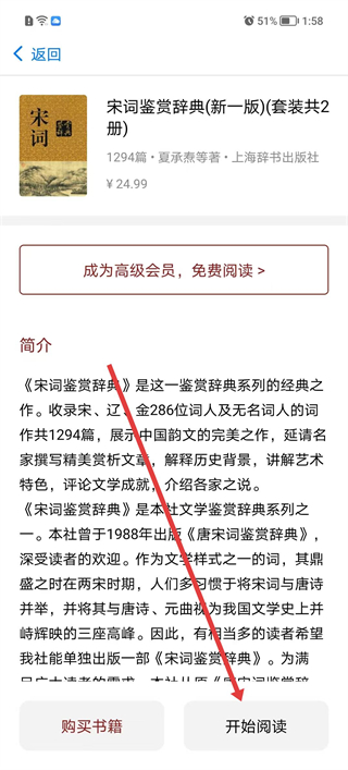 4、在書籍詳情頁查看書籍簡介,可選擇購買書籍或成為高級會員免費閱讀,點擊開始閱讀即可瀏覽書籍內容。