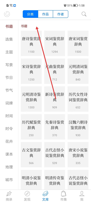 2、點擊文庫選項進入書籍分類頁面,可按主題、寫景等分類查找典籍,快速定位想要閱讀的書籍。