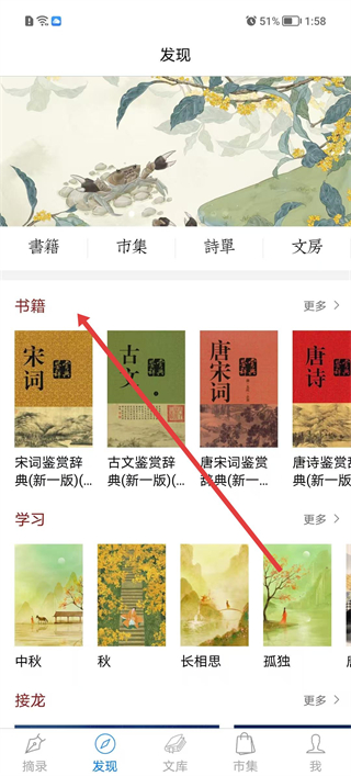 1、進入發現頁面,點擊書籍板塊可查看宋詞鑒賞辭典、古文鑒賞辭典等典籍,選擇心儀書籍進入詳情頁。