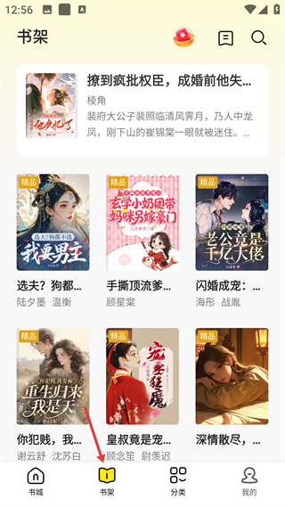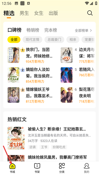 1、書城首頁,展示口碑榜、熱銷紅文,按題材分類呈現作品,是發現熱門網文的核心入口。