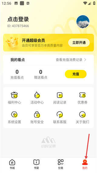 4、該界面是個人中心,支持登錄、開通會員,提供看點充值等功能,是管理賬號與閱讀權益的入口。