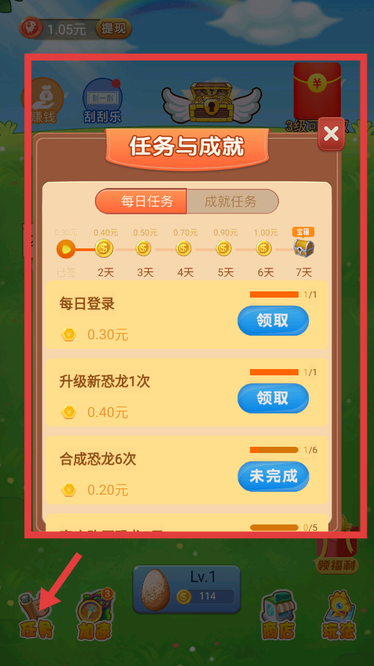 4、進入任務與成就界面,升級快需積極完成每日任務和成就任務,完成后領取金幣獎勵,用這些金幣購買龍蛋或恐龍,加速恐龍的升級與合成。