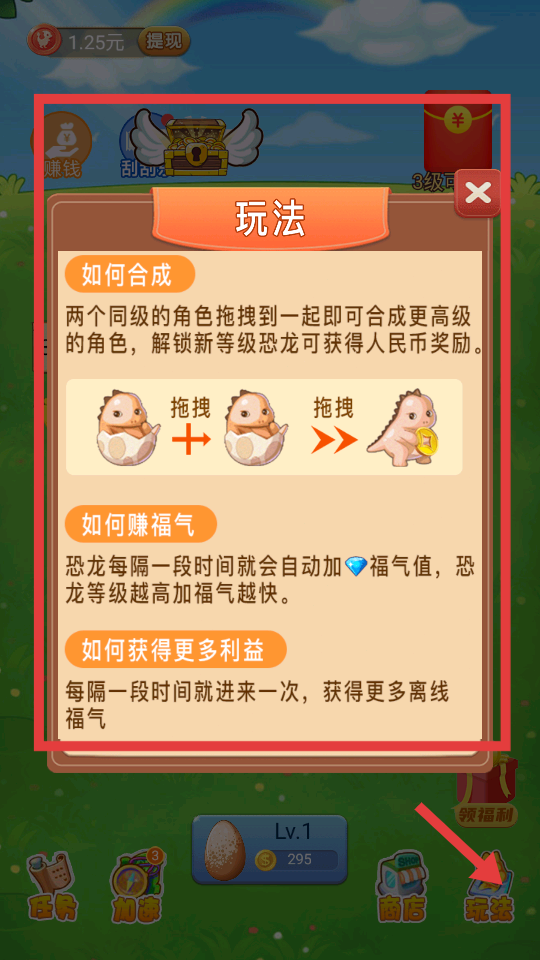 1、點擊右下角查看要升級快需利用合成機制,把兩個同級恐龍拖拽合成更高級恐龍,同時恐龍會自動加福氣值,等級越高加得越快。