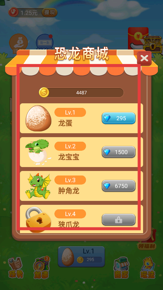 3、接著可在商城用鉆石購買更高級的恐龍,直接獲得高等級恐龍,減少合成的時間成本,快速提升整體恐龍等級推動游戲進程。
