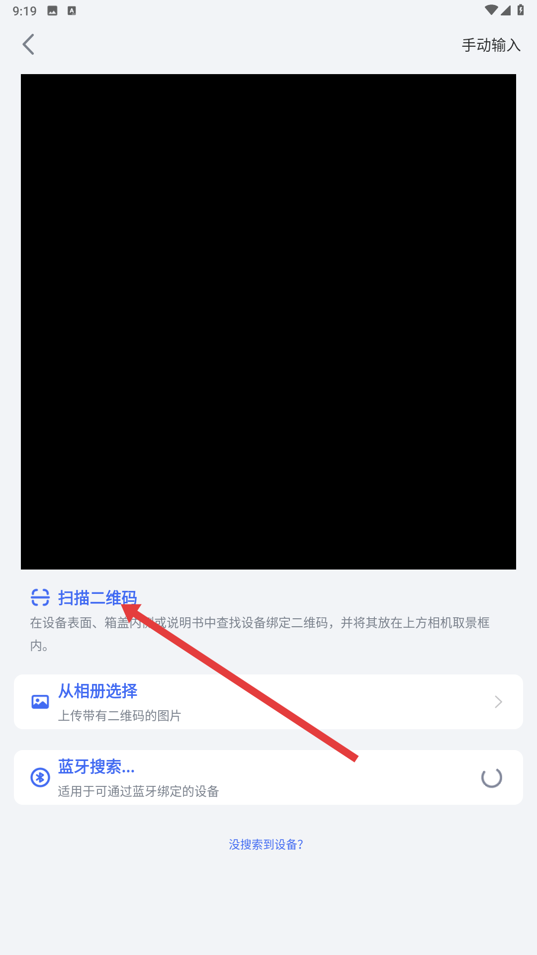 4、設備綁定界面,可選擇掃描二維碼、從相冊選擇或藍牙搜索等方式綁定設備,掃描二維碼時需將設備綁定二維碼放入相機取景框內。