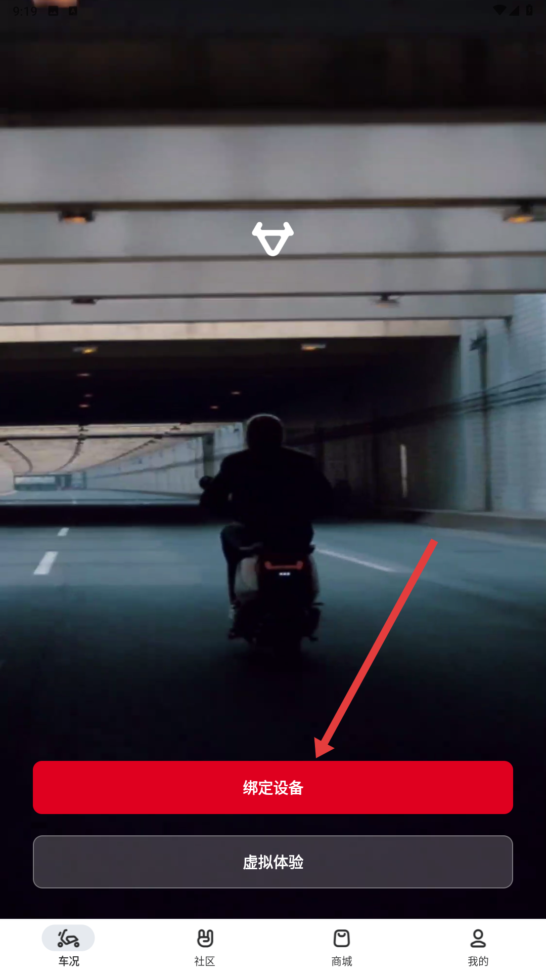3、登錄后進入綁定設備界面,點擊綁定設備按鈕,可開始綁定電動車設備的流程。