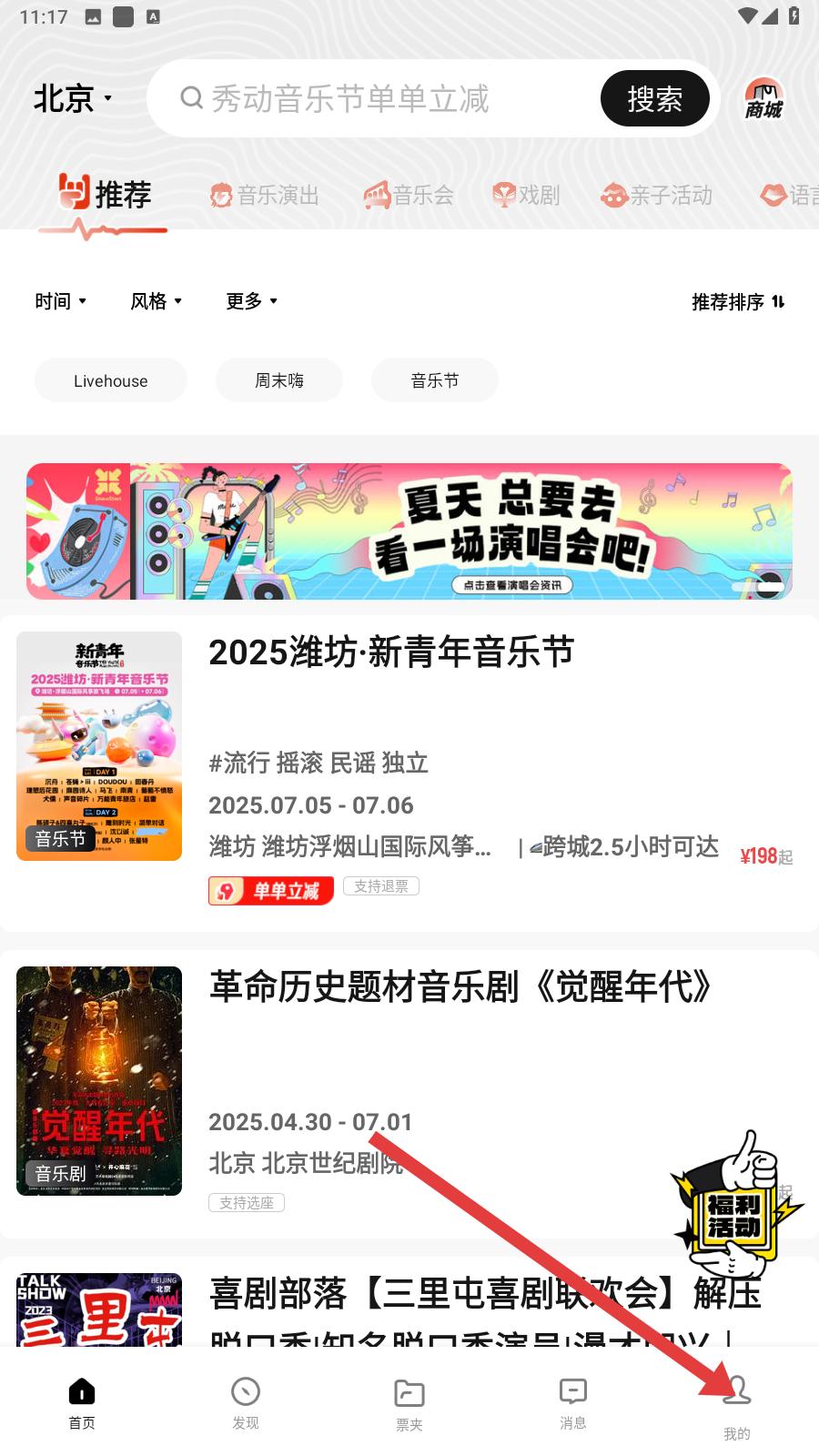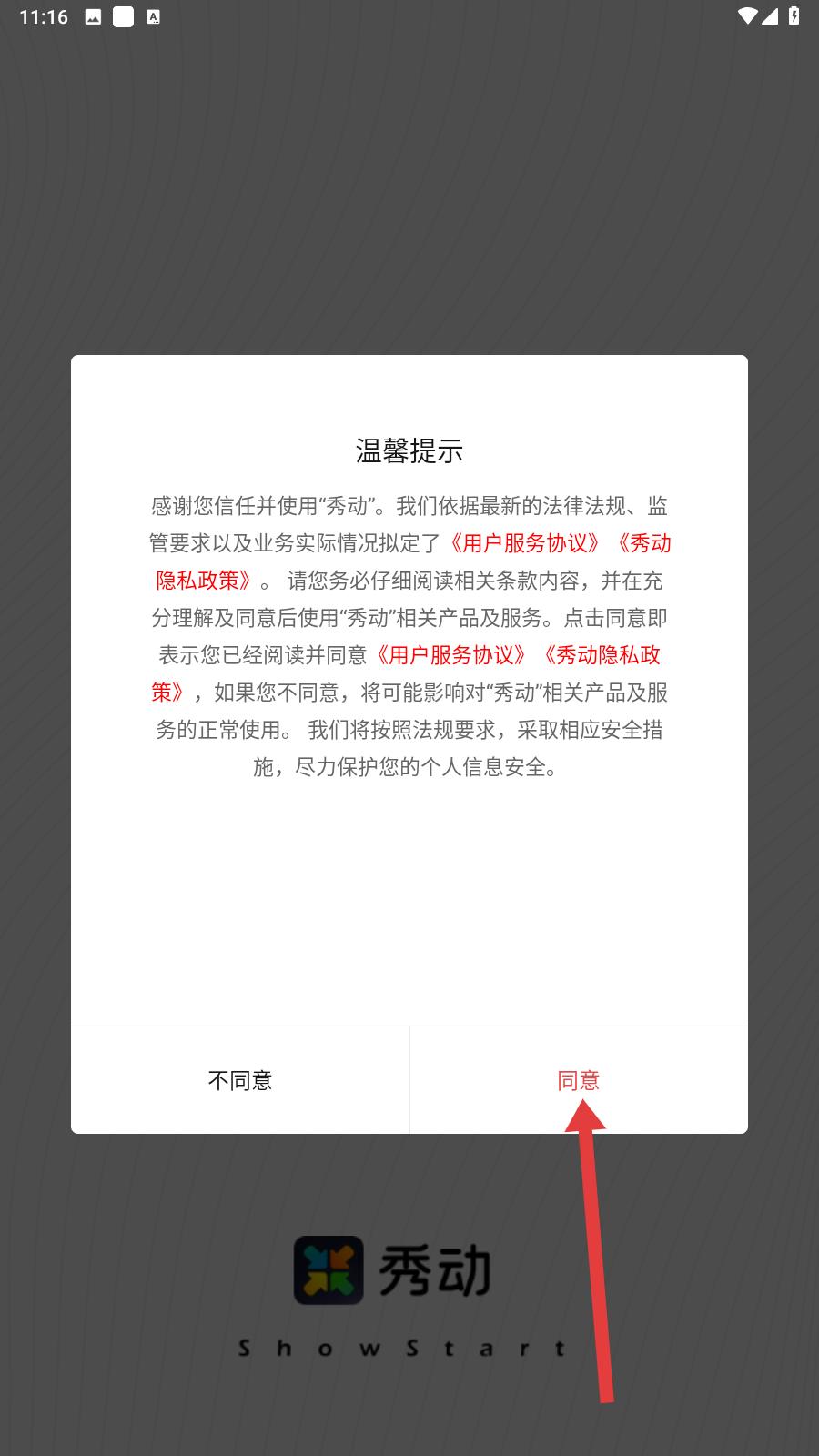 1、打開秀動,點同意溫馨提示,進入后選我的,點擊去登錄完成登錄,可在首頁搜演出,篩選音樂,戲劇等活動,購票參與。