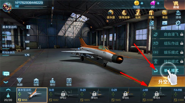 4、選擇單人模式,點擊升空按鈕,參與空戰任務,獲取戰斗經驗和獎勵,提升戰機等級和戰力。