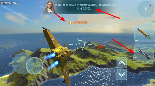1、順著雷達箭頭找到敵機,使用導彈和機炮將其消滅,應對導彈來襲,提升空戰技巧和戰機生存能力。