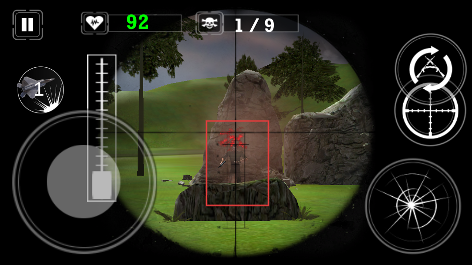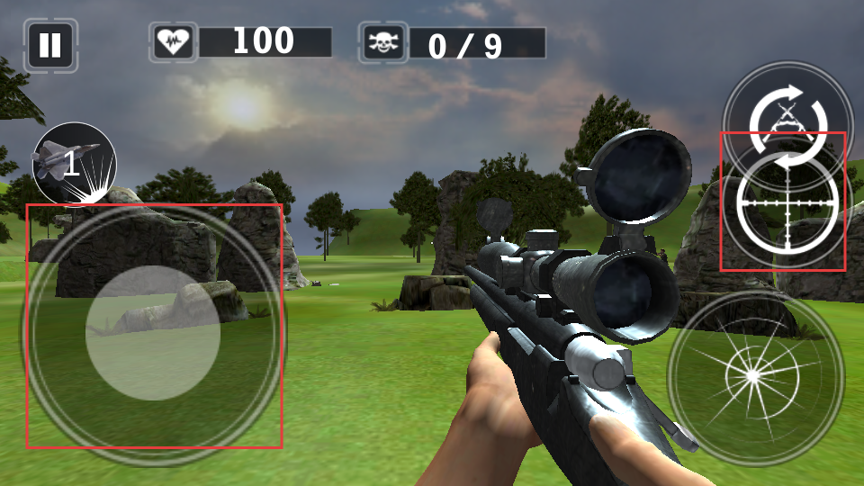 1、用左側虛擬搖桿移動視角,尋找敵人蹤跡,同時點擊右側瞄準按鈕,開啟瞄準鏡,仔細觀察場景中的各個角落,鎖定目標。