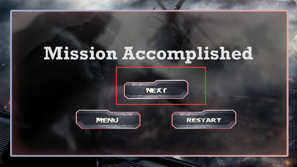 3、成功消滅所有指定敵人后,任務完成,會出現Mission Accomplished界面,可點擊NEXT按鈕進入下一關,也能返回菜單或重新開始本關。