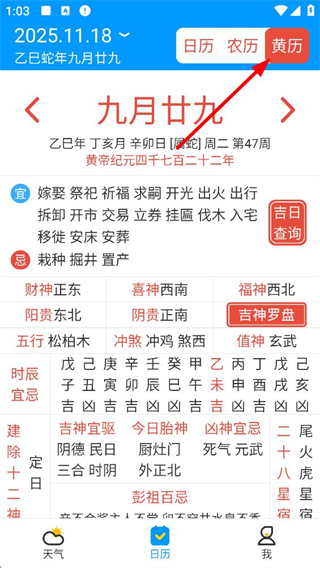 4、點擊黃歷選項,可查看當日的宜忌事項、財神喜神方位、五行沖煞、時辰宜忌等詳細黃歷信息,助力了解傳統擇吉相關內容。
