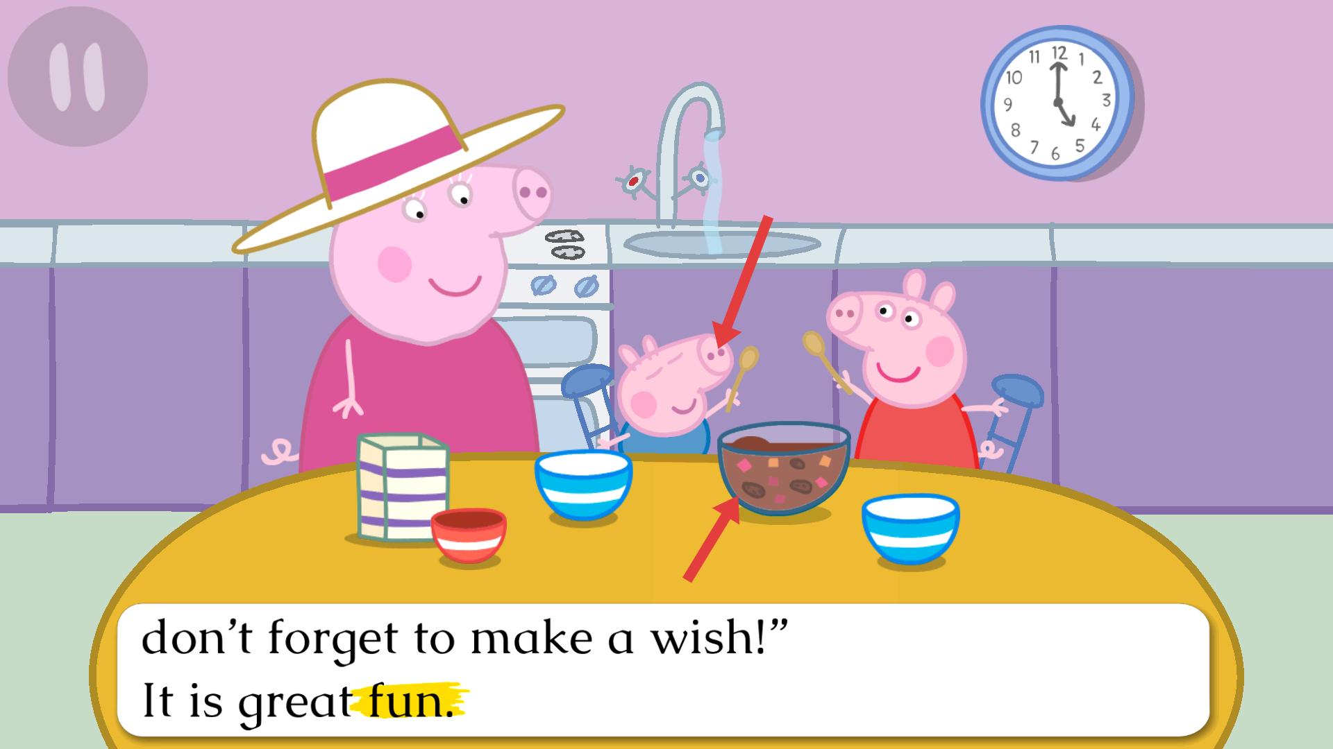 4、在廚房場景,和佩奇、喬治一起制作美食,按照提示參與攪拌等操作,過程中別忘記許愿,享受制作的樂趣,完成這一環節的互動。