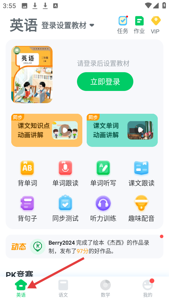1、英語學習應用首頁,需登錄后設置教材,提供課文知識與單詞動畫講解,還有背單詞、聽力訓練等多樣學習功能及競賽入口。